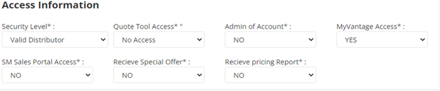 · My Vantage Access – Allows the User to use the MyVantage Pages on the site. Company managers may want their underlings to be able to purchase, but NOT see order status or invoices etc…