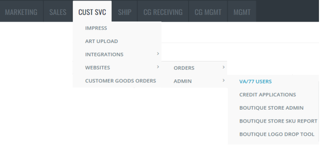 The Web Users page is accessed via the Main Menu by clicking the CUST SVC button, and by hovering over the WEBSITES – ADMIN menu options, and by clicking the VA/77 USERS link.
