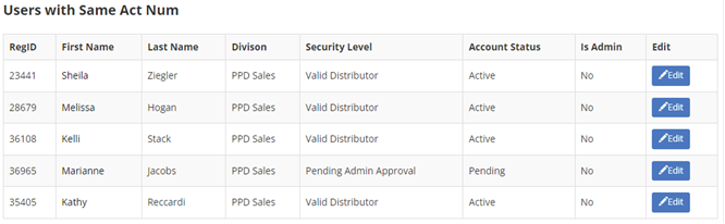 This section is used to View/Edit other users that share the same account number. This is useful to see who the admin on the account is, and for the CSR to maintain the list of access for employees of a given company.